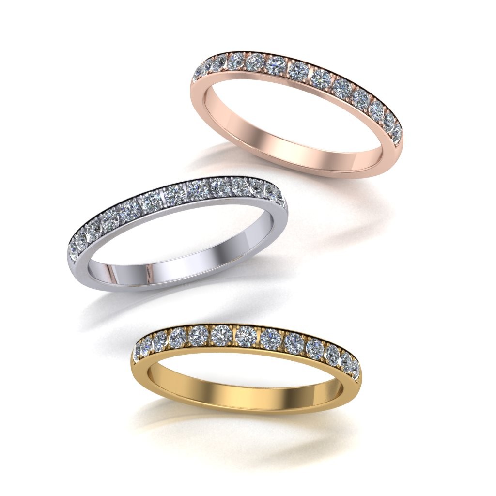 An eternity ring can make a set of rings complete with a third ring sitting beside the engagement ring and wedding ring or alternatively a stand-alone ring. Traditionally given on the first anniversary or birth of your first child. Like your wedding ring the eternity ring can be made to fit the opposite side of your engagement ring to complete your set. Diamonds are traditional but alternative coloured stones can be used on another finger.